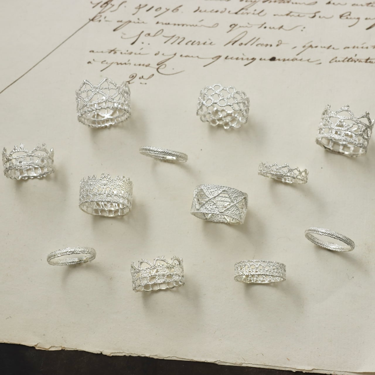 レースから型を取り、地金を流し込む技法を
